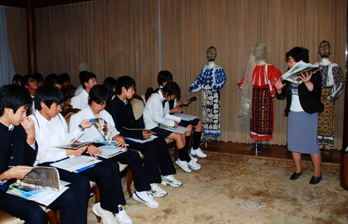高知・大豊町中学校が大使館訪![]() 2010年10月20日、高知県の大豊町立大豊町中学校の2年生29人が、異文化交流学習の一環として、ルーマニア大使館を訪問しました。アウレリアン・ネアグ大使(当時)の歓迎の挨拶を受けた中学生らは、ティハン・ディアナ書記官から、ルーマニアの地理、言語、食べ物、有名人などの説明を聞いた後、交流協会会員でもある杉野服飾大学の川口素子先生から、ルーマニアの民族衣装について説明を受けました。 1時間余りの短い時間でしたが、中学生たちにとっては、初めての大使館訪問は、大変有意義な時間になったようです。 後日、中学生代表の原達也、西山和真、三谷晃平3君から、次のような礼状が届きましたので、転載いたします。 ◇ ルーマニア大使館の皆様へ 寒さも一段と厳しくなってきましたが、大使館の皆様、お元気ですか? さて、私たちの修学旅行では、お忙しい中、私たち大豊町中学校2年生の訪問を受け入れていただき、ありがとうございました。プレゼンや実物を準備し、くわしくルーマニアについて、説明していただいて、ルーマニアの国についていろいろなことを知ることができました。 特に、印象に残っているのは、日本とルーマニアの文化の違いです。例えば、、ルーマニアでは地方がいくつにも別れていて、その地方ごとに料理や民族衣装がまったく違うということです。 民族衣装の中には、毛皮のついたあったかそうなものや、細かいししゅうをほどこしたりしたものがあって驚きました。 食文化についても、地方ごとに食べる物も違いがあるようでした。日本よりおいしそうなパンやチーズがありました。 それから、ルーマニアの料理は油をたくさん使った肉料理や、果物をスープに使って酸味を出したり、工夫がされているものばかりで、とてもおいしそうでした。 また、ユネスコに登録されている、すばらしい世界遺産がたくさんあるという事も知りました。 大使館訪問は初めての体験で、大使館の敷地に一歩足を踏み入れただけで、外国(ルーマニア)にいるということが、とても不思議な気がしました。 短い時間でしたが、一生思い出に残る貴重な体験となりました。これを機会に、世界に目を向けていきたいと思います。 私たちを受け入れて下さった大使館の皆様、本当にありがとうございました。 2010年12月2日 大豊町中学校2年代表 原達也、西山和真、三谷晃平 |